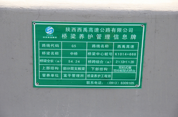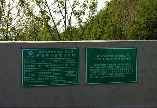 桥梁“养护管理信息牌”准确显示了桥梁中心桩号、桥梁全长、桥跨组合、上部结构、下部结构等桥梁基本信息,明确桥梁养护工程师和管养单位,公开桥梁养护管理制度,为今后桥梁日常养护管理提供了数据依据,并将管养责任落实到人。