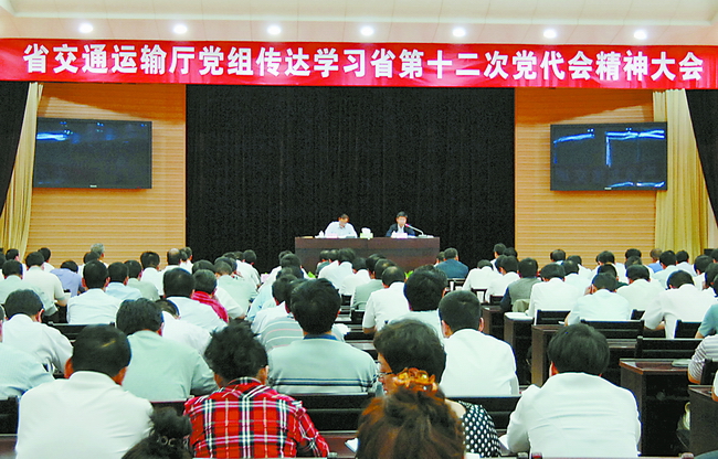5月14日,省交通运输厅党组召开领导干部大会,传达学习省第十二次党代会精神。厅党组书记、厅长冯西宁主持会议,宣读了《中共陕西省委办公厅关于认真学习宣传贯彻省第十二次党代会精神的通知》,全文传达了赵乐际书记在省委十二届一次全会上的讲话,并就相关工作进行了安排部署。厅党组副书记、副厅长胡保存传达了省委书记赵乐际在省第十二次党代会上的讲话精神。厅领导、厅直各单位党政领导干部、厅机关全体干部职工参加会议。