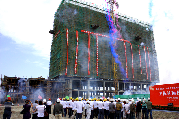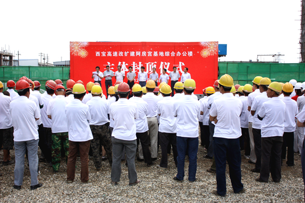 5月29日上午,陕西高速集团西宝分公司阿房宫基地在建综合办公大楼横幅满挂、彩旗飘飘。随着鞭炮声响起,大楼顺利实现封顶。