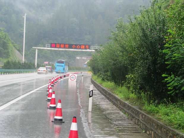 一是摆放预防性标志。针对事故多发的水泥路面、隧道弯道提前摆放标志标牌,实行单道通行,提前提示车辆减速慢行,有效预防事故;二是蹲点值守,喊话提示。针对此次连续阴雨天气,宁陕路政中队及时调配人员,在八宝坪隧道出口和良心隧道出口两大纵坡处实施24小时不间断鸣笛喊话,提醒司乘安全驾驶,顺利通过事故高发区域;三是加强灯光照明。为了排除阴雨天气视线不畅等因素,及时打开全线所有隧道入口加强照明,确保车辆顺利通行,同时开启沿线所有警示灯提示标志,为车辆提供良好视距;四是充分利用沿线情报板,发布路况信息。积极联系安康市移动公司,向通过西汉高速公路山区段车辆发布手机路况信息,提前做好制动应急。