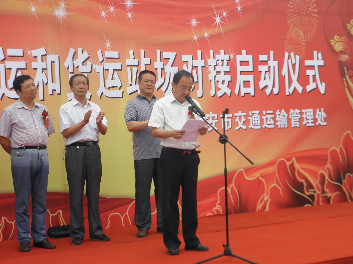 马旭处长在仪式上回顾了近年来西安市道路货物运输发展的历史,分析了道路货物运输发展的现状和存在问题,并对如何做好对接工作提出了两点希望:一是希望充分发挥快捷货运和货运站场对接的平台作用,利用运输企业的专业化优势和货运站场货源集中的区位优势,促进各类物流资源有效利用、进一步降低物流成本、提高物流效率;二是希望快捷货运从业人员和货运部经营者充分发挥对接的主体作用,增强发展意识、品牌意识、竞争意识,按照市场需求改进和完善经营过程,努力实现信息对接、供应量对接、诚信对接和服务对接,让广大老百姓在家门口享受到安全、快捷、优质的运输服务。