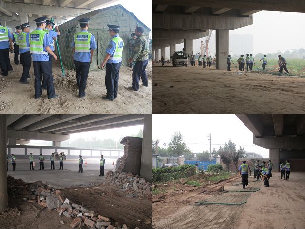 8月15日,由西耀分公司分管领导带队,西耀路政大队在泾河管委会、高陵县国土局和当地公安部门的大力协助下,组织人员开展联合执法,依法对高陵光明房地产有限责任公司违法占用公路用地的施工工区进行强制拆除。