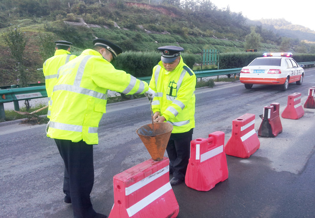 为使废旧水马得到重新利用,节约成本,黄陵管理所在保畅实践中不断摸索,制作漏斗、铁杆,往水马内装填沙土。通过使用表明,这种水马使用方式,还有四个优点:一是工具制作简单,长期使用,方便携带;二是可以就地取材,操作简单,提高了工作效率;三是变废为宝,过去被车辆撞坏的水马,现在装上土之后可以再次使用;四是加上土的水马,防撞效果明显,规范了保畅设施。