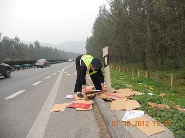 黄陵路政中队成立了宣传小分队,通过在服务区、收费站、沿线村镇发放宣传单,并利用沿线情报板进行宣传,重点对车辆抛洒、乱堆乱放、摆摊设点等所造成的安全隐患进行宣传,充分调动广大群众举报的积极性,积极争取群众支持,对于及时举报违规行为,经查实的,给予一定的经济奖励,并为其保密。