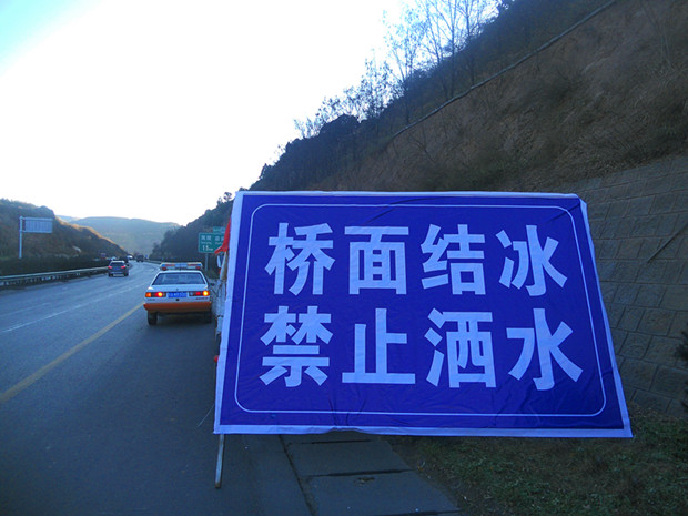 康崖底大桥位于包茂高速铜延段K692处,北连道南隧道,往南是弯道,其往西安方向处于连续下坡路段。进入冬季以后,该区域气温较低,加之重载货车下坡给轮胎洒水降温,导致桥面夜间出现结冰现象。从11月初开始,西延分公司加大管理力度,集中做好防滑保畅工作。