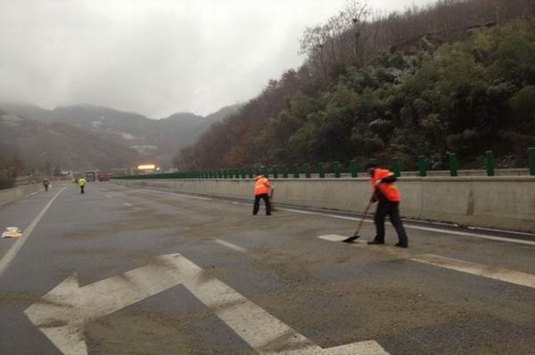 三是强化除雪保畅举措,重点区域管控到位。实行沿线桥涵和重要路段定人定点定责24小时巡查制度,对下雪路段,迅速组织播撒融雪剂消除路面积雪。大力调配人员实行机械与人工相结合的方式除冰,全力保障重点路段安全畅通。目前共投入除雪车24台班,人员48工日,抛洒融雪剂4.3吨,防滑砂4立方。