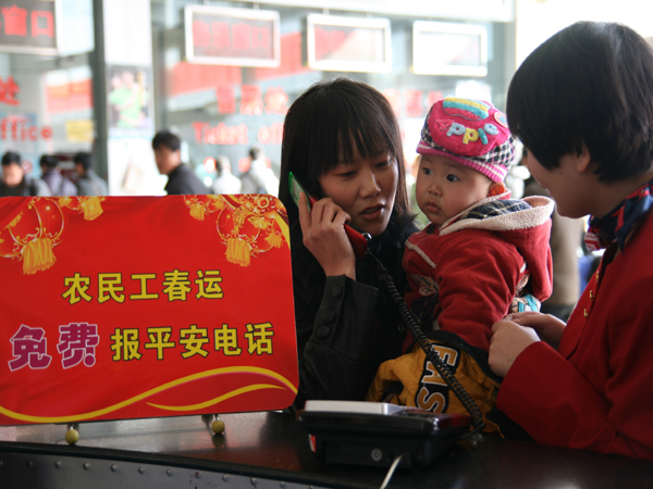 为方便农民工返乡,各客运站加强与厂矿、建筑企业等农民工聚集地的联系,开展上门售票、团体票预订等服务,根据需要组织客运班车和包车直达运输服务,实行农民工包车、团体购票票价优惠20%的政策,并增设农民工售票窗口。西安市城西客运站开通了 “农民工返乡免费报平安电话”并与多家主流媒体,合作推出“温暖回家路——一百张车票免费送”温情活动,为旅客提供更加安全、优质、舒心的服务。西安市城南客运站与西安市工会联系,推出农民工出行绿色通道,对团体包车农民工提供接到站,送到家的服务。