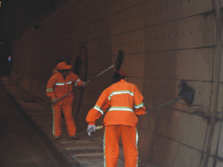 李家河隧道群全长6572m,每日流量过万,位于长大纵坡路段,车辆刹车频繁、喷淋严重,隧道内壁瓷片、警示标志、指示灯箱等安全设施受油烟、泥浆、煤水等污染严重,各类安全设施能见度低,效果大打折扣,极大影响了隧道的路容路貌和车辆行车安全。