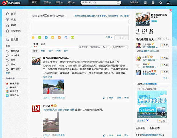 微博由专人负责信息输入和更新管理,对外发布辖区公路最新通行路况、施工路段告示、路政法律法规及路政许可办理等咨询服务,运行以来,已发布信息80多条,为公众出行提供了便利,引起了广泛关注。有网友通过微博及时反映遇到的突发路况信息,有咨询出行信息,有提出意见建议,微博服务及管理正逐步实现常态化。
