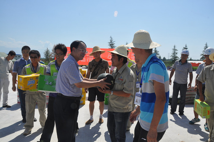 陈主席一行在现场听取管理处情况汇报之后,代表厅交通运输厅、省交通运输工会向冒酷暑奋战在一线的劳动者表示了深切的问候。陈主席强调三星电子快速干道能取得目前“高速度、高标准”的成绩,离不开一线劳动者的辛勤劳动,他勉励项目部管理人员要积极开展劳动保护监督检查,按照四部委《防暑降温措施管理办法》,合理调整工作时间,配备充足的防暑降温用品,做好后勤保障,力争为广大员工提供一个更加舒适的工作生活环境,确保安全生产,为陕西高速公路建设作出贡献。省厅与集团领导还与一线工人亲切交谈,了解工人们的作息时间和饮食卫生情况,把慰问金和一箱箱清凉饮品发放到工人们手中。