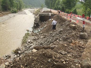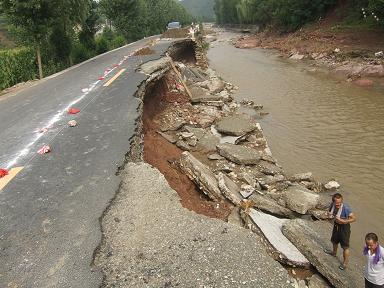 近日,商洛市商州区、洛南县、丹凤县三县突降暴雨。由于降雨量过大,S307线洛柞路四皓至板桥段沿线河道洪水暴涨,20多处河水涌上路面。据统计,此次水毁S307线商洛路共有4段360米路基被洪水完全冲毁。冲坏路基22956立方米/1.3公里,冲毁路面5187平方米/1.04公里,冲毁涵洞2道,冲垮挡墙32处30405立方米/2.04公里,泥石流、坍塌方780立方米/3处,水毁道班房8间/两栋。水毁损失1587.61万元。