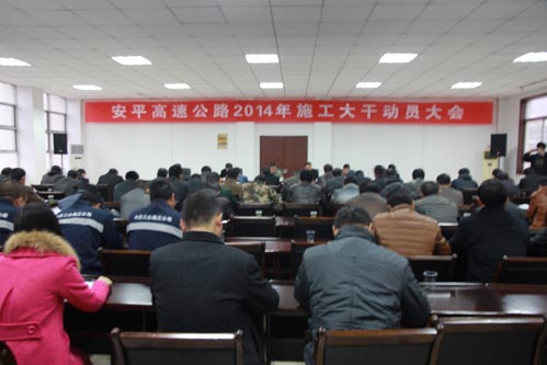 2月28日上午,安平高速公路召开施工动员大会。14家施工单位的项目经理、书记和总工,5家驻地监理工程师、总监办总监、中心试验室主任、外资办机关部分人员和管理处全体人员共100人参加。省厅总会计师李峥嵘和相关处室人员调研建设工地并参加了动员会。