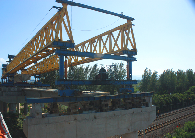 陇海铁路是我国东西交通运输大动脉,路务繁忙,平均五分钟经过一个车次,因而施工过程不容闪失。为确保整个施工平稳进行,铁路部门根据每次停运的90分钟时间,将架梁过程分为三个阶段:8月13日下午3时架桥机过孔,8月14日和18日下午分别架设两片箱梁。