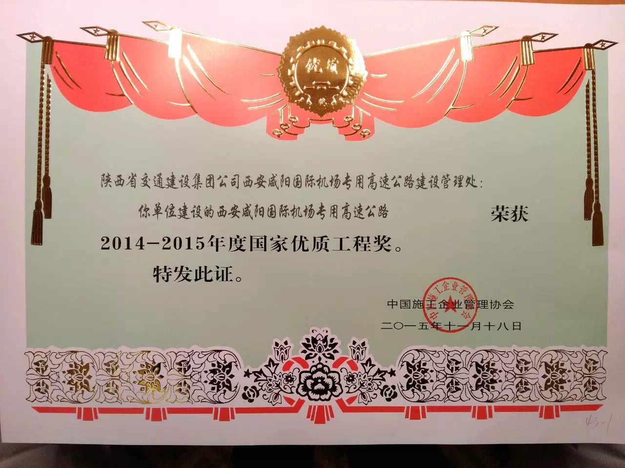 12月18日,2014-2015年度创建国家优质工程总结表彰大会在北京饭店金色大厅召开。会议对获得2014-2015年度国家优质工程奖、2014-2015年度国家优质工程奖突出贡献者、2015年度全国工程建设企业质量管理优秀单位、2015年度全国工程建设项目优秀设计成果一等奖进行表彰。西安咸阳国际机场专用高速公路建设项目凭借着优良的工程质量、优美的行车环境、先进的施工技术、一流的建设管理,荣获2014-2015年度国家优质工程奖。 西安咸阳国际机场专用高速公路在2015年荣获陕西建设工程长安杯奖和国家优质工程奖两个奖项,这是对西安咸阳国际机场专用高速公路建设项目最高的褒奖,也是对机场分公司精细化运营管理的最好肯定,机场分公司亦将在今后的运营管理中,以规范的养护管理、优美的路容路貌、优质的公路服务为目标,充分展示“省门第一路”的突出成就,为树立西部强省窗口形象做出应有的贡献!