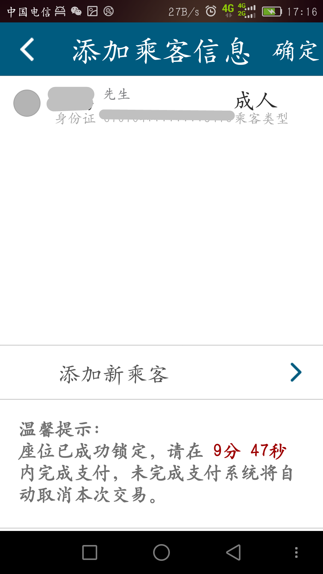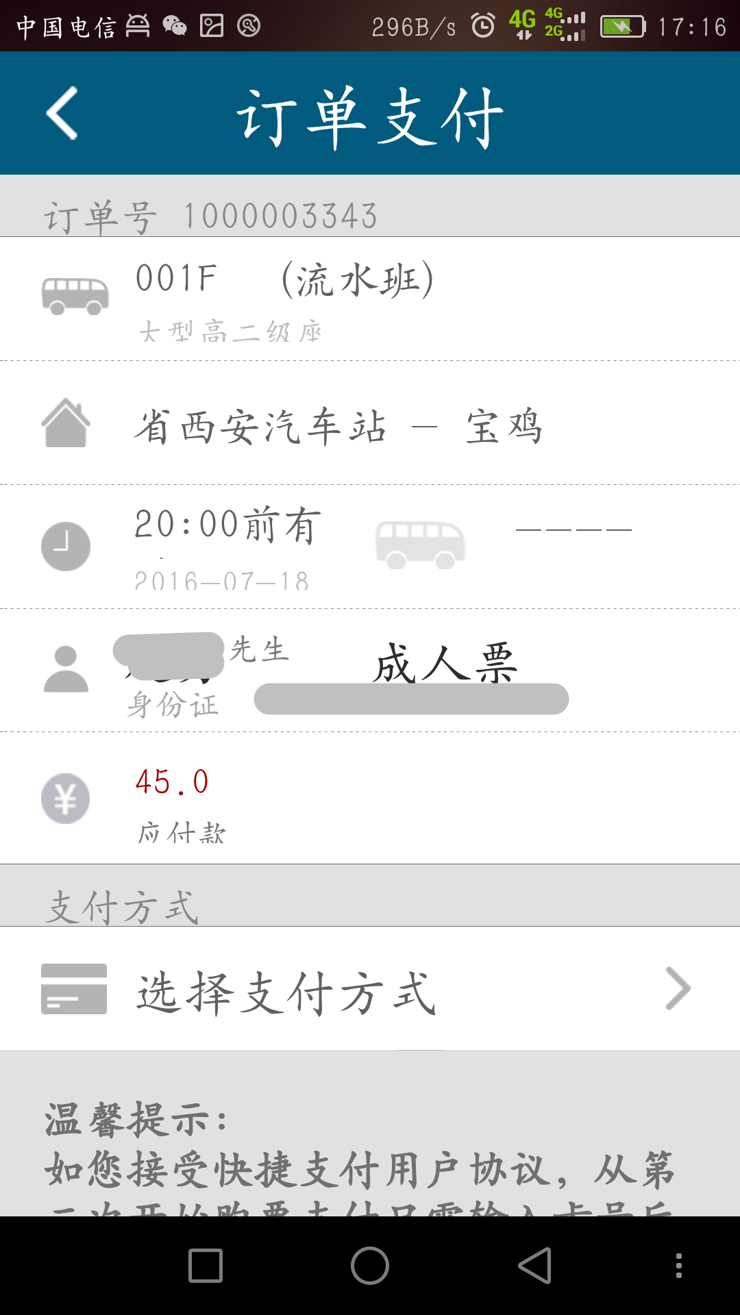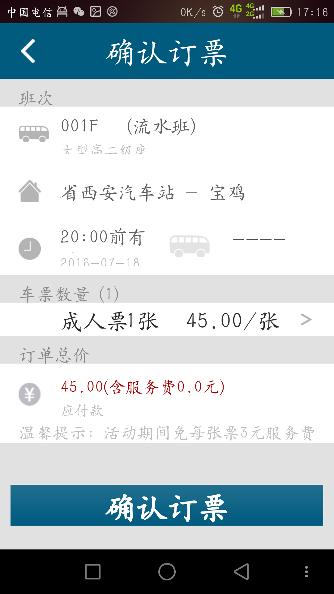 3.信息确认:班次信息确认无误后点击“确认订票”——添加乘客信息——订单信息核对无误后选择支付方式(目前支持支付宝和银联两种支付方式)