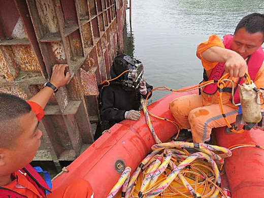 此次水下基础检测的方法是采用水深测量仪(超声波法)对河床断面进行量测,并根据情况绘制河床断面图。潜水员携带水下摄像机对墩柱、基础水下部分进行详细的目视检查,通过与潜水员实时沟通,描述水下检查病害现状,现场做好文字及影像记录。水下基础检测的内容包括:一是检查钢筋混凝土墩柱、墩身、承台有无出现开裂和混凝土剥落、露筋的状况;二是检查水下墩柱及基础有无出现冲刷、掏空、缺损、孔洞,了解构件的损伤、损坏、腐蚀情况等,并确定病害位置、尺寸及严重程度;三是检查水下桩基与承台连接部位外观情况,混凝土是否存在剥落露筋、钢筋锈蚀的现象;四是通过测量桥址处水位、水深状况和与竣工资料对比,分析桥址处河床冲刷或淤积情况;五是检查构件表面有无水生物覆盖、附着,确定生物质地及覆盖率。