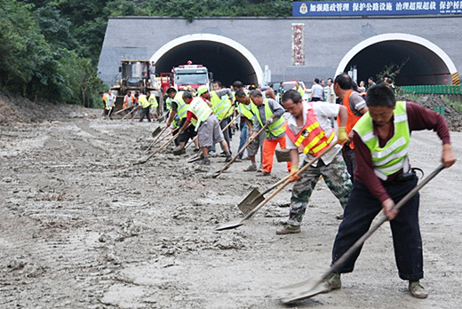 灾情发生后,分公司领导带领值班干部和路政、养护人员火速赶往洪花寺隧道、才子隧道等水毁较为严重的路段现场指挥。路政人员协助高速交警在略阳立交、略阳主线收费站对甘肃、安康方向车辆紧急分流。西乡、汉台、勉县3个管理所迅速调集铲车、自卸车,组织抢险队伍,携带抢险物资、设备、柴油及应急食品,赶往略阳参与抢险。当天中午一点半,才子隧道泥石流清理完毕,甘肃往汉中方向道路畅通,略阳主线站入口滞留车辆正常上路通行。下午五点半,洪花寺隧道出口泥石流清理完毕,略阳县往甘肃方向道路全部畅通,滞留车辆有序进站,安全通行,至此十天高速西乡至略阳段全线畅通。