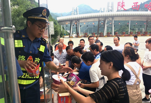 略阳收费站、主线收费站交通管制后,及时做好滞留司乘的安抚、解释工作。开启应急抢险专用通道,安排专人值守,确保救灾物资、设备、人员快速到达救灾现场。开放两个收费站大小会议室供滞留收费站的老人、小孩临时休息,职工食堂为滞留人员提供免费午餐,并在便民服务亭提供手机充电、饮用热水,发放面包、方便面、纯净水等食物供司乘免费食用。在通信网络中断的情况下,迅速联系电信公司在略阳站设置应急信号基站,保证司乘人员通信畅通。此次共发放泡面10余箱、面包60袋、饮用水16箱,为400余名滞留司乘送上了“爱心餐”,赢得了广大司乘人员的理解和赞誉。
