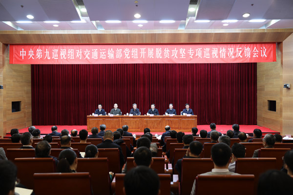 根据党中央统一部署,2018年10月20日至11月30日,中央第九巡视组对交通运输部党组开展了脱贫攻坚专项巡视。巡视组坚持以习近平新时代中国特色社会主义思想为指导,深入贯彻党的十九大精神,牢固树立“四个意识”,坚定“四个自信”,把“两个维护”作为根本任务,贯彻中央巡视方针,牢牢把握脱贫攻坚专项巡视的再监督工作定位,聚焦脱贫攻坚政治责任深入开展监督检查,督促各级党组织和领导干部强化政治责任担当,推动解决脱贫攻坚过程中存在的突出问题,为如期实现脱贫攻坚目标提供坚强政治保障。中央巡视工作领导小组听取了巡视组的巡视情况汇报,并向中央政治局常委会会议报告了有关情况。