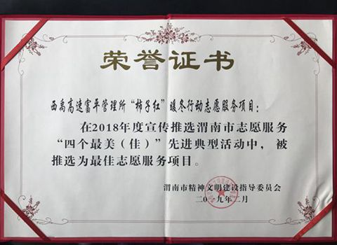 近日,西禹公司富平管理所“柿子红”暖冬行动志愿服务项目在2018年度渭南市志愿服务“四个最美(佳)”先进典型活动中,被渭南市精神文明建设指导委员会推选为最佳志愿服务项目。