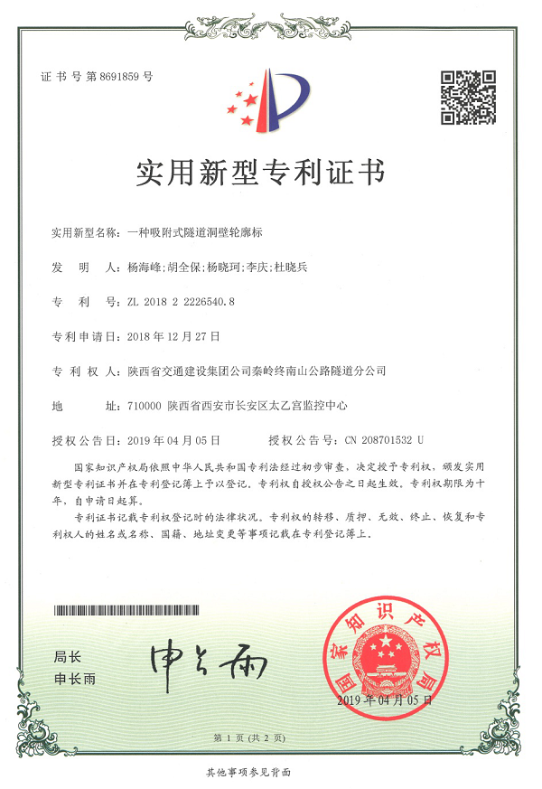 为进一步加大隧道运营管理方式的创新,保护工作创新知识产权,提升隧道运营管理手段,近日,该新型《吸附式隧道洞壁轮廓标》获得国家实用新型专利,专利号:ZL 2018 2 2226540.8。