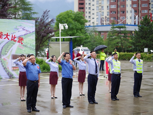 10时,全体参赛人员整齐列队,随着分公司经理一声令下,大比武活动拉开帷幕。队列队形比赛中一支支队伍高喊嘹亮的口号跑步进场,着装统一、眼神坚毅,身姿挺拔、步伐整齐,鞋跟带起的缕缕水花更显飒爽英姿。