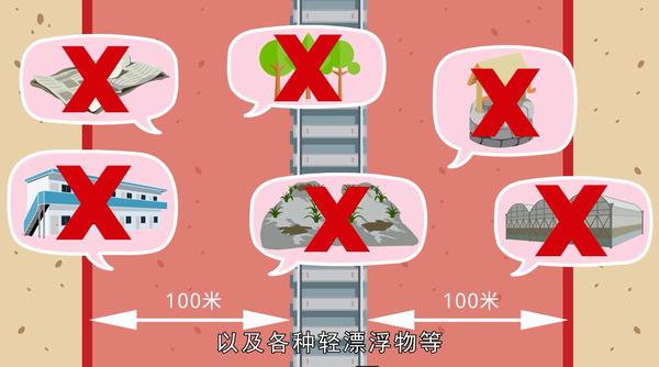 高铁沿线政府和中铁西安局集团公司需要及时清理、整治铁路用地(红线)、安全保护区和沿线100米范围内潜在的安全隐患。如:彩钢瓦房、建(构)筑物、养殖场、停车场、塑料大棚类、堆放类及民用水井、高大树木以及各种轻漂浮物等。