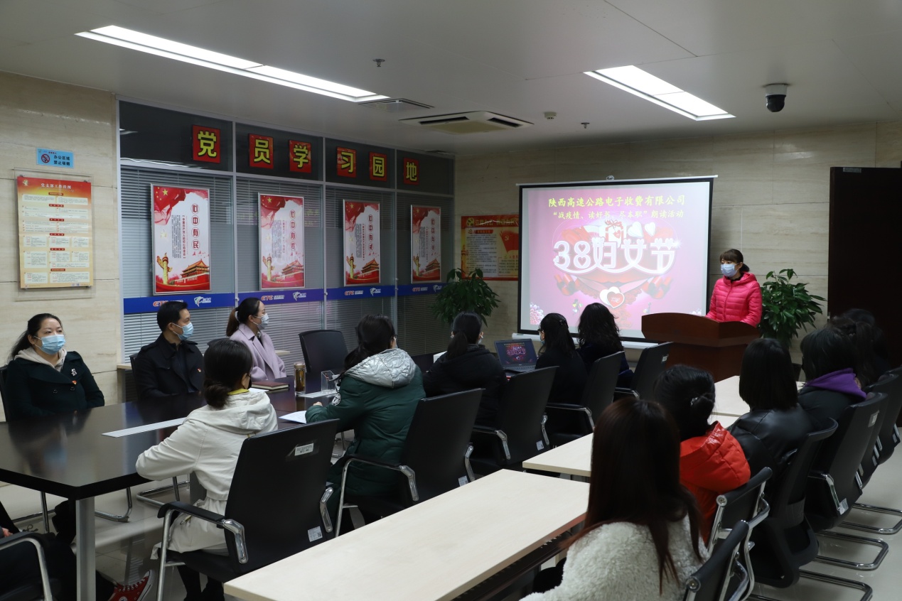 为激励公司女职工团结一心,立足岗位,展现“巾帼”风采,推进我省ETC发行服务能力提质增效,助力ETC推广应用展新颜、拓新篇,在第110个“三八”国际劳动妇女节即将来临之际,在做好疫情防护工作的前提下,3月6日上午,陕西高速公路电子收费有限公司组织女职工开展“战疫情、读好书、尽本职”朗读活动。周玉林董事长作“三八”节致辞,向公司女职工致以节日的问候。