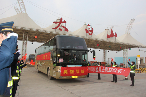 当日18时10分,抗疫英雄在警车护送下,乘坐10辆大巴顺利通过太白山收费站。列队欢迎的同志,拉起印有“热烈欢迎赴鄂抗疫勇士凯旋归来!”的横幅,挥动手中的红旗,热情欢迎英雄归来。各位抗疫英雄在车内向大家挥手致意。在场的各位同志深为气氛所感染,纷纷表示要向各位英雄看齐,立足本职,坚决打赢这场抗疫战。据悉,本次归陕的为我省第四批和第五批赴鄂医疗队177人。他们将在太白山疗养院进行14天的休养调整后重返工作岗位。