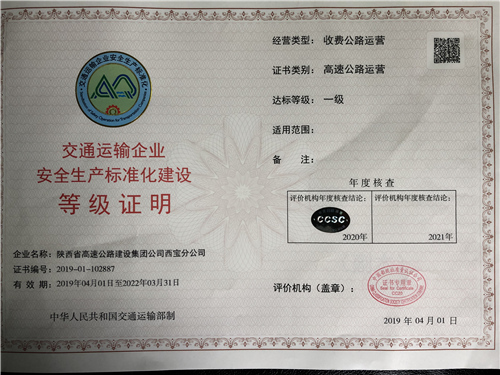 2020年4月26日,西宝分公司以969分的成绩顺利通过交通运输部企业安全生产标准化2020年度审核。过去的一年,西宝分公司狠抓安全管理不放松,严格落实安全生产标准化各项要求,扎实开展安全日常隐患排查及专项排查,狠抓隐患整治,广泛开展安全教育培训,认真整改安全生产标准化初审提出的各项问题。