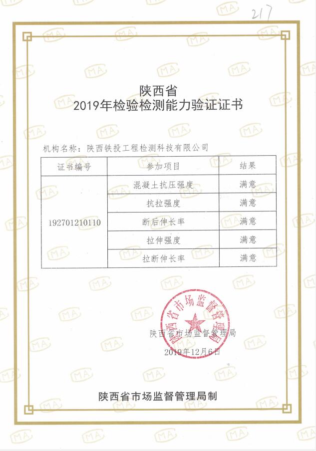 5月19日,省铁路集团铁投检测公司顺利领取了陕西省市场监督管理局颁发的《陕西省2019年检验检测能力验证证书》。按照陕西省市场监督管理局《关于开展2019年度检验检测能力验证工作的通知》要求,公司积极报名参加了此次能力验证活动建材类的混凝土抗压强度测定(回弹法)、热轧带肋钢筋拉伸性能测定、高分子防水片材拉伸性能测定三个项目,首测结果全部为满意,顺利通过能力验证。