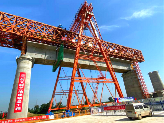 7月7日,在造桥机的牵引下,一段长3.3米、重约250吨的箱梁被精准提架到阎良至机场城际铁路泾河特大桥29号至30号桥墩之间,标志着我国城际铁路最大跨度预制胶接法拼装箱梁首孔架设施工完成。