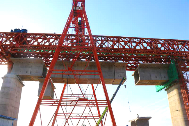 据介绍,64米跨度的一孔节段箱梁总重高达2500吨,难以进行整孔架设操作。按照设计要求,建设者将一孔箱梁化整为零,分割为15个节段进行预制,并像穿糖葫芦一样逐一吊装和拼接,确保桥梁结构整体安全。