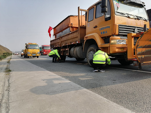 在除雪保畅工作开展过程中,由于两省道路通行均存在长大坡路段,路面积雪结冰导致车辆出现打滑无法正常通行,针对此情况,西渭分公司提前储备防滑垫,在易打滑路段设置保畅小分队,当发现除雪车辆及社会车辆出现打滑险情时,第一时间铺设橡胶防滑垫,协助车辆快速、安全通过易滑路段,为除雪保畅工作提供助力。