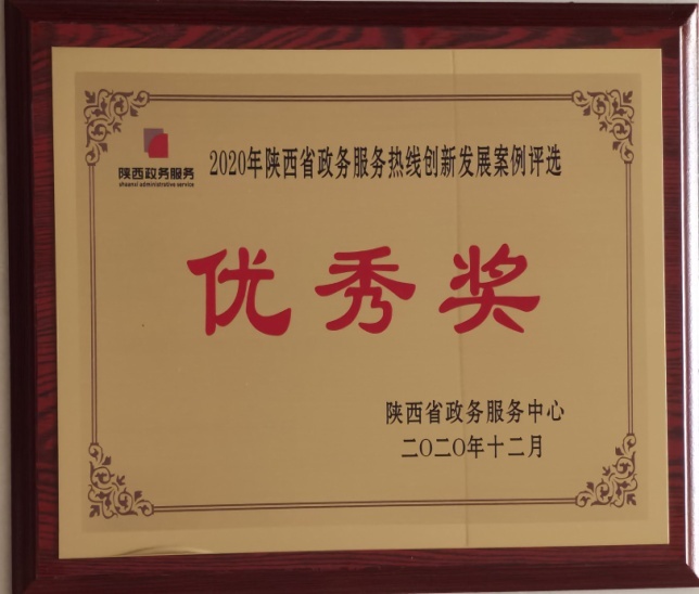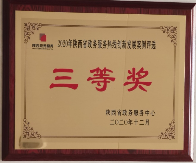 2020年12月,陕西省政务服务中心组织了全省非紧急政务热线创新发展案例评选活动,陕西12328报送的《发挥信息服务优势 保障便捷安全出行》、《热线电话就是好 投诉解决不过夜》服务案例分别荣获全省政务热线创新发展案例“三等奖”、“优秀奖”,这也是陕西12328荣获的第6个省级荣誉。