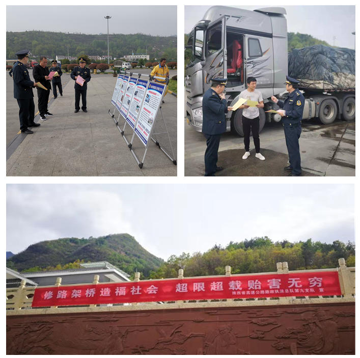 图为总队第九支队利用办公场所、高速公路收费站、服务区、停车区等场所,通过悬挂宣传标语(含电子标语)、摆放宣传展板、发放宣传材料、设立咨询台等形式开展宣传活动,并利用门户网站、微信、电子情报板等发布《治超条例》内容。截至目前,共出动车辆26台次,人数48人次,悬挂横幅8条,利用电子情报板发布宣传标语8条,发放宣传单页1300余份。