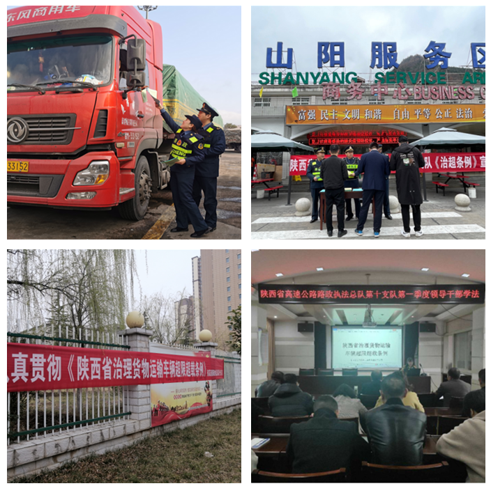 截至目前,该总队制定印发了高速公路路政执法系统《治超条例》宣贯通知,组织机关领导干部集体学习了《治超条例》相关内容,在西安周边高速公路设置跨线桥公益广告4块,在门户网站开设的《治超条例》专栏浏览量达到2903次,微信公众号浏览量达到196次。各支队结合工作实际,组织全体路政执法人员学习了《治超条例》全文,在高速公路收费站、服务区等人员密集区域,通过悬挂横幅、设置咨询点、发放宣传单等方式,向过往行人和司乘人员详细讲解高速公路超限超载治理、路政执法等方面的法律法规和政策规定,收到了良好的宣贯效果。