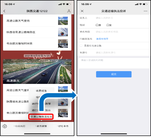 2.陕西交通12122微信服务号、订阅号政务政策栏目的交通运输执法投诉专栏或人工客服
