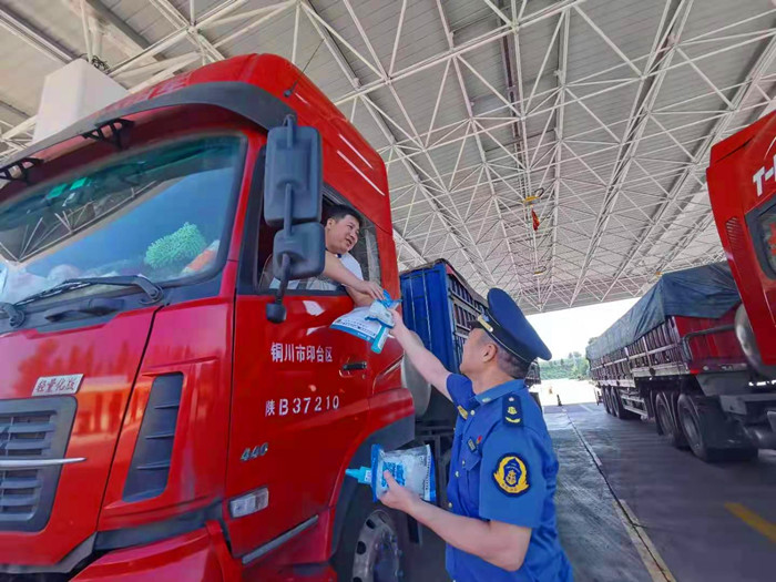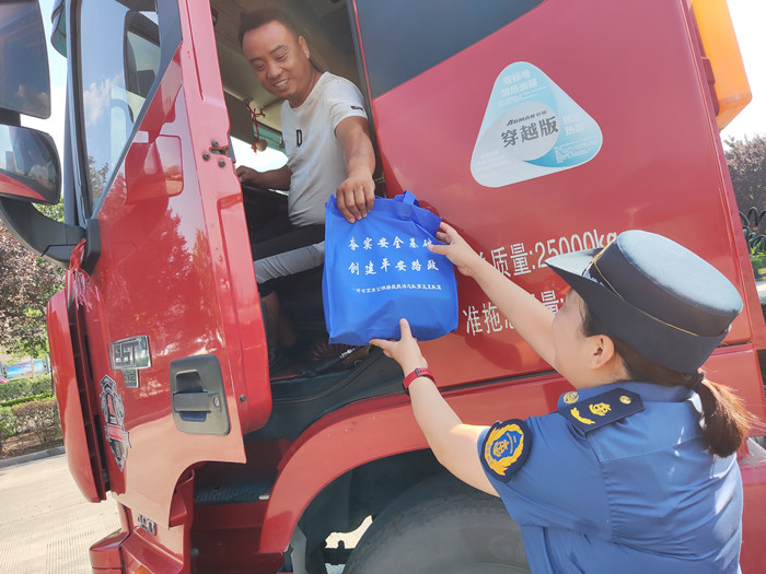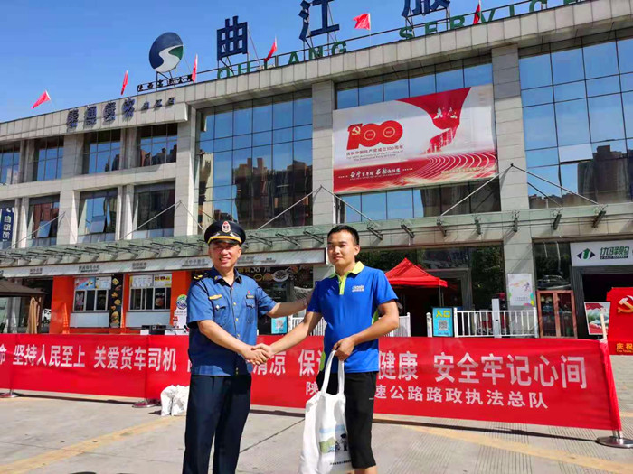 按照省厅和交通运输工会的部署,7月13日上午,全省高速公路路政执法系统组织开展了以“践行初心使命,坚持人民至上,关爱货车司机,高温敬送清凉,保证身心健康,安全牢记心间”为主题的为大货车司机“送清凉”活动。活动由总队和11个支队领导带队,全系统统一行动,分别在高速公路服务区、收费站出入口等安全位置,为行驶高速公路的广大货车司机送去毛巾、矿泉水、绿茶饮品、风油精等防暑降温品,同时也进行了法制宣传,受到了广大货车司机和群众的高度赞誉。本次“送清凉”活动是全省高速公路路政执法系统深入开展党史学习教育“我为群众办实事”实践活动的一项具体行动,共向广大货车司机送去矿泉水、绿茶饮品、毛巾、风油精等。