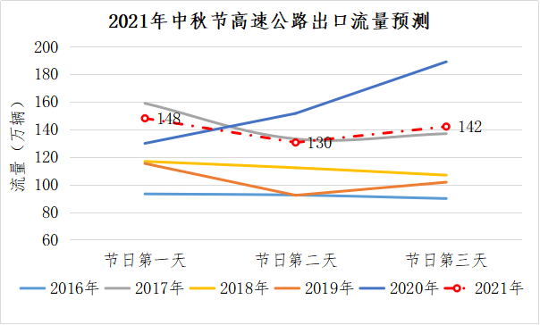 图 1 2016-2020年全省高速公路中秋节出口流量及2021年预测流量