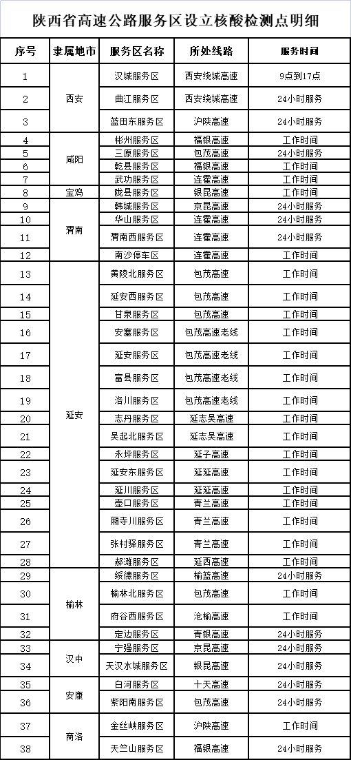 10、陕西省高速公路哪些服务区可以进行核酸检测?