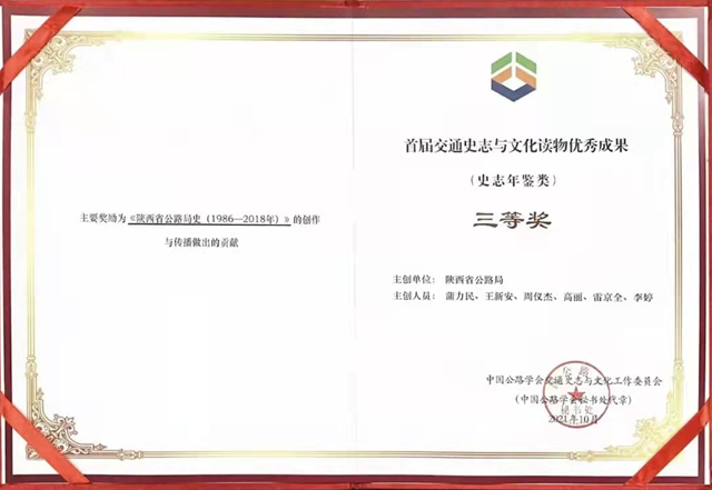 日前,在由中国公路学会交通史志与文化工作委员会、人民交通出版社,长安大学人文学院联合举办的“第一届全国交通软科学研讨会”上,公布了首届交通史志与文化读物优秀成果评选结果,由陕西省公路局主持编撰的《陕西公路局史(1986-2018)》获得史志年鉴类三等奖。