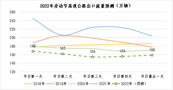 预计2022年劳动节全省高速公路网收费站出口总车流量将达到800万辆,日均160万辆,是平日流量的1.8倍,较2021年劳动节下降27%,较2020年劳动节下降8%。