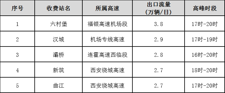 劳动节期间流量较大的收费站多集中在西安周边。收费站出、入口流量较大的收费站主要有六村堡、汉城、灞桥、新筑、曲江。