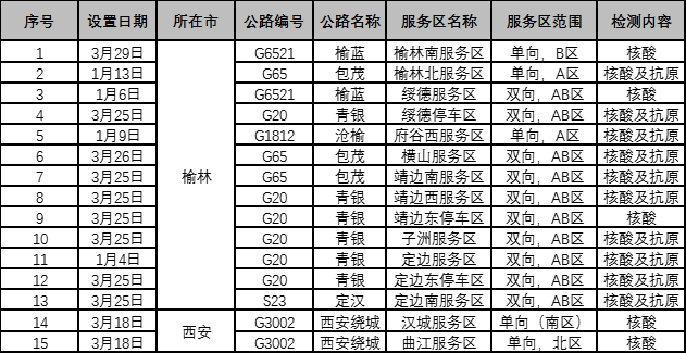 为减少因人员流动带来的疫情传播风险,陕西省在15个服务区设置有核酸检测点,具体如下: