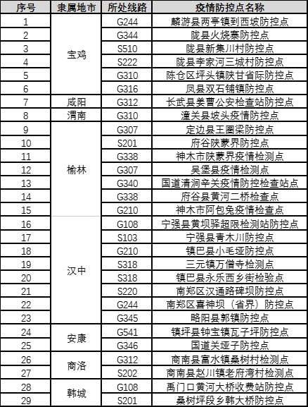 截止4月27日,全省无因疫情原因封闭的高速公路收费站与服务区。因属地疫情防控,部分收费站出口设有检查点,卫健疾控、公安交警部门对中高风险地区(外省)车辆人员进行劝返或隔离,其余车辆人员须配合进行测温登记、扫码或查验核酸检测报告,具体详情可通过“陕西交通12122”微信公众号“路况信息”栏目查询。