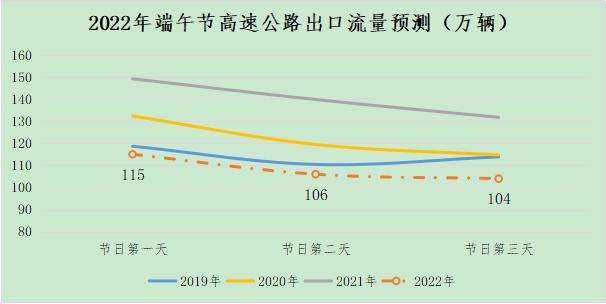 二、 全省高速公路整体流量预测目前我省疫情防控平稳有序,西安等部分地市倡导就地过节。端午节预计城市周边户外景区流量较大。预计今年端午节全省路网流量较平日增幅较大,与去年相比有所减少。小长假三天全省高速公路网收费站出口总车流量将达到325万辆,日均108万辆,较平日流量增长14%,较2021年端午节下降23%,较2020年端午节下降11%。
