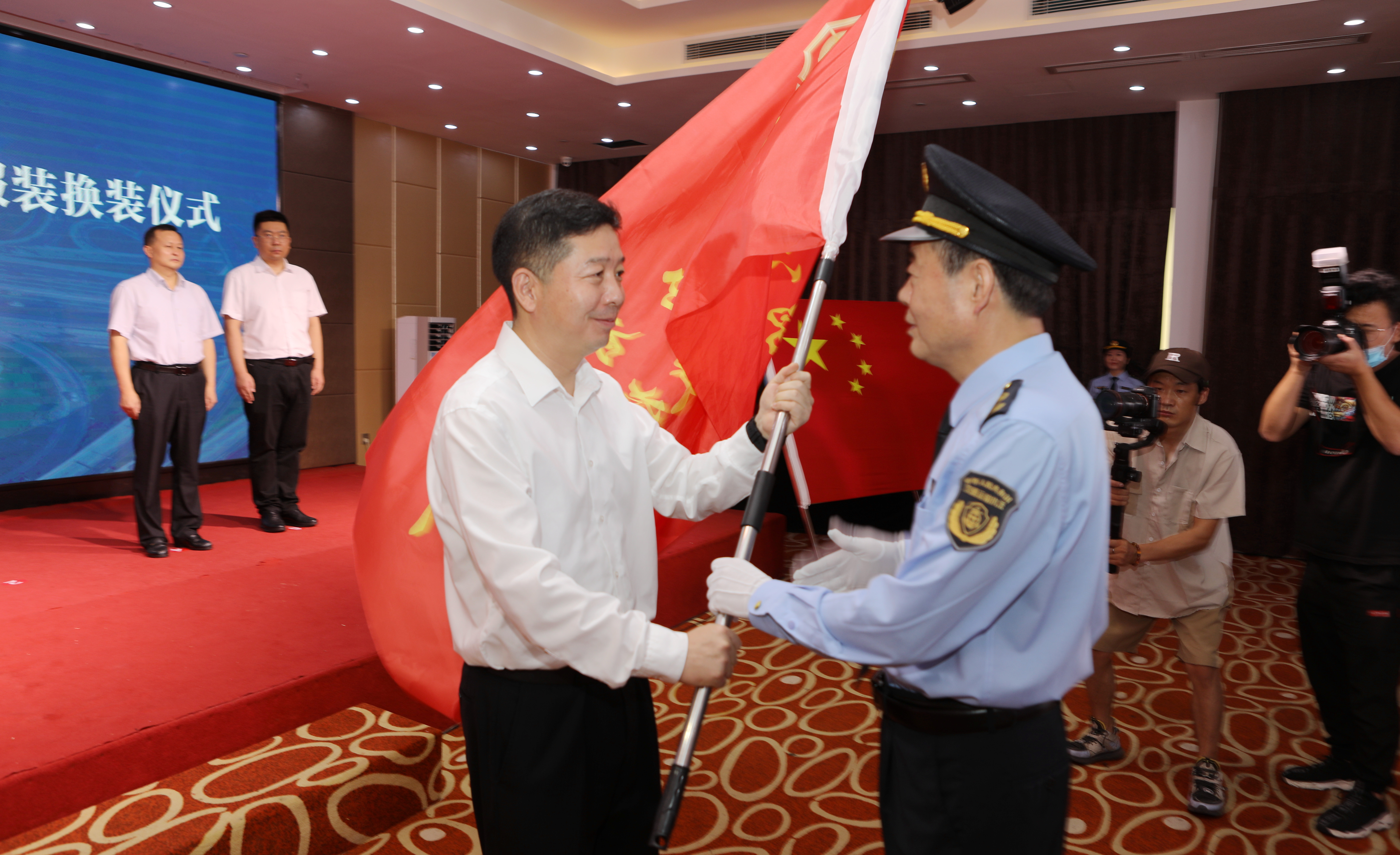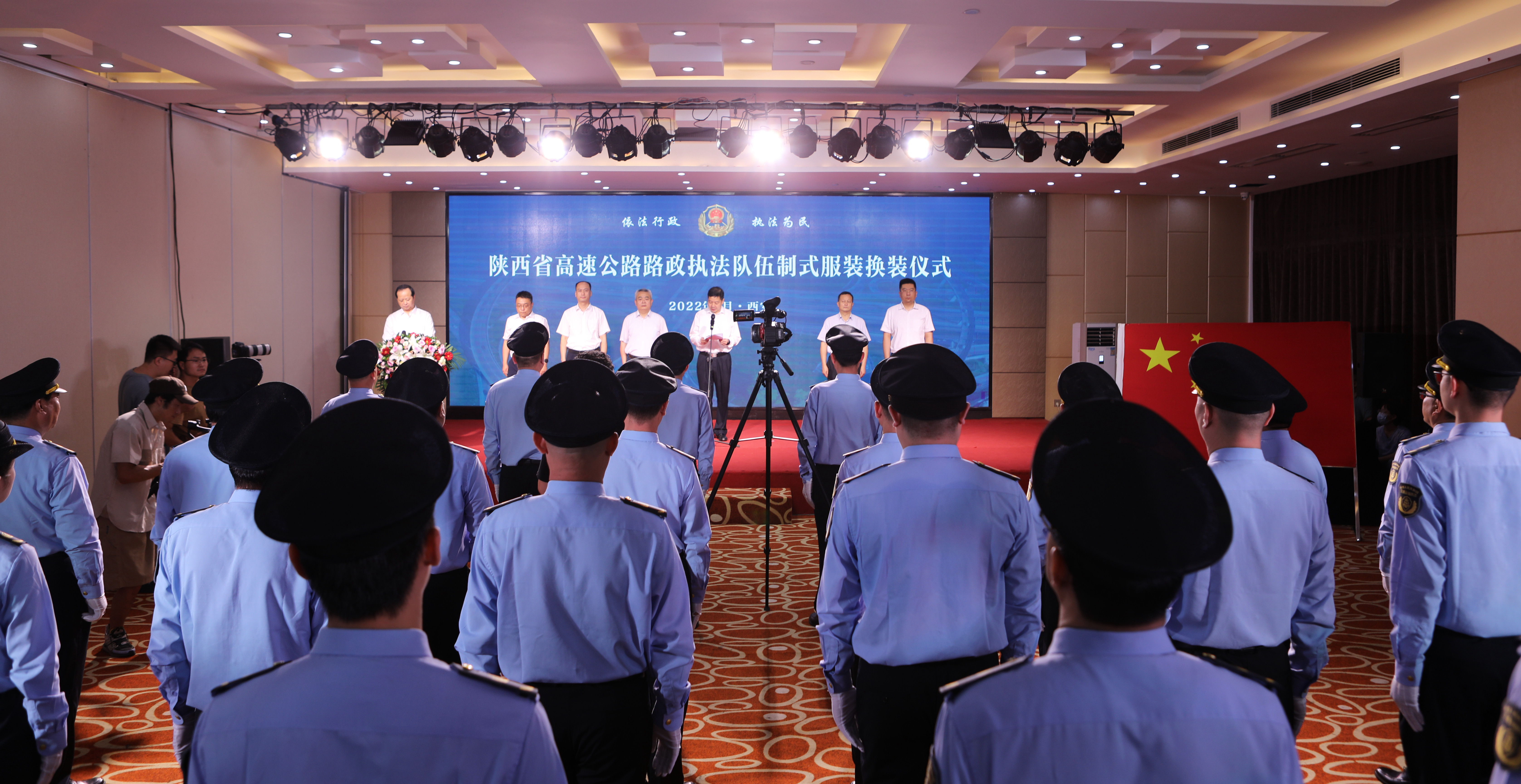 8月11日,全省高速公路路政执法队伍制式服装换装仪式在西安举行,省交通运输厅厅长王海鹏讲话并为省高速公路路政执法总队授队旗,副厅长戴滨华主持仪式,省高速公路路政执法总队长陈拴会作表态发言。厅机关有关处室负责人、省路政执法总队领导班子成员、总队第一至第十一支队的支队长等参加换装仪式。